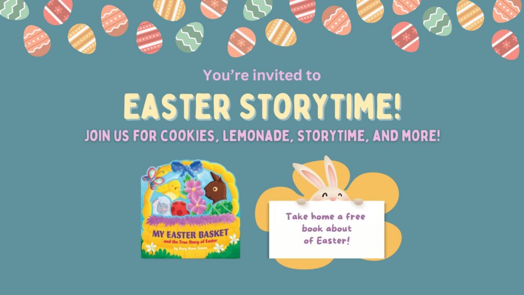 Join us for a fun and meaningful Easter event hosted by First Presbyterian Church and Joyful Noise Christian Childcare. We’ll gather in the sanctuary on Tuesday, March 31 at 5:15 for songs and stories, and then we’ll have cookies and lemonade in the church lounge. Each family will receive an Easter book to take home.