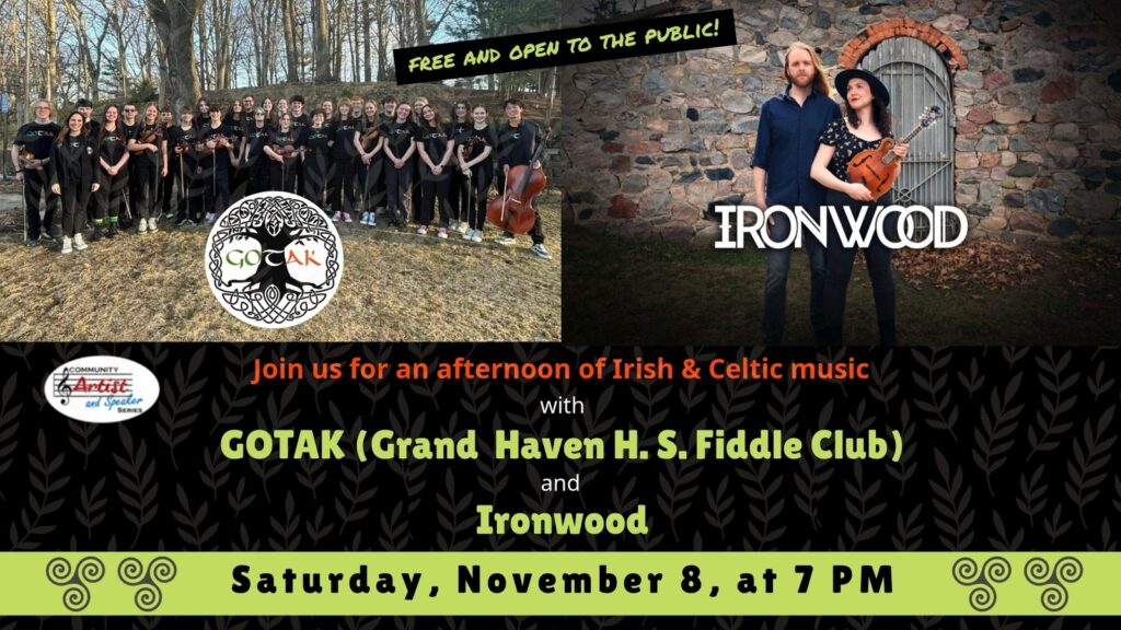 Ironwood is a husband-and-wife acoustic duo from Holly, MI, inspired by both Celtic and American folk traditions. Anna brings vocals, fiddle, and mandolin to the stage, while Mark adds rich layers on acoustic guitar and electric bass. Together they create a vibrant mix of original songs and traditional Irish and folk tunes. Whether recorded or live, their performances are full of energy—and this folkin’ band is sure to get you on your feet!