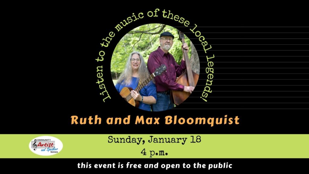 Don’t miss this chance to see these musical local legends! Celebrating almost 50 years of making music together, Ruth’s award winning abilities as a songwriter and singer are accented by Max’s harmony and touch on the upright bass. With influences of folk, bluegrass, and country, they have created a heart-touching, audience-pleasing acoustic Americana sound that is all their own. Ruth’s trademark rich alto is unmistakable, and her songs evoke images and emotions common to us all.