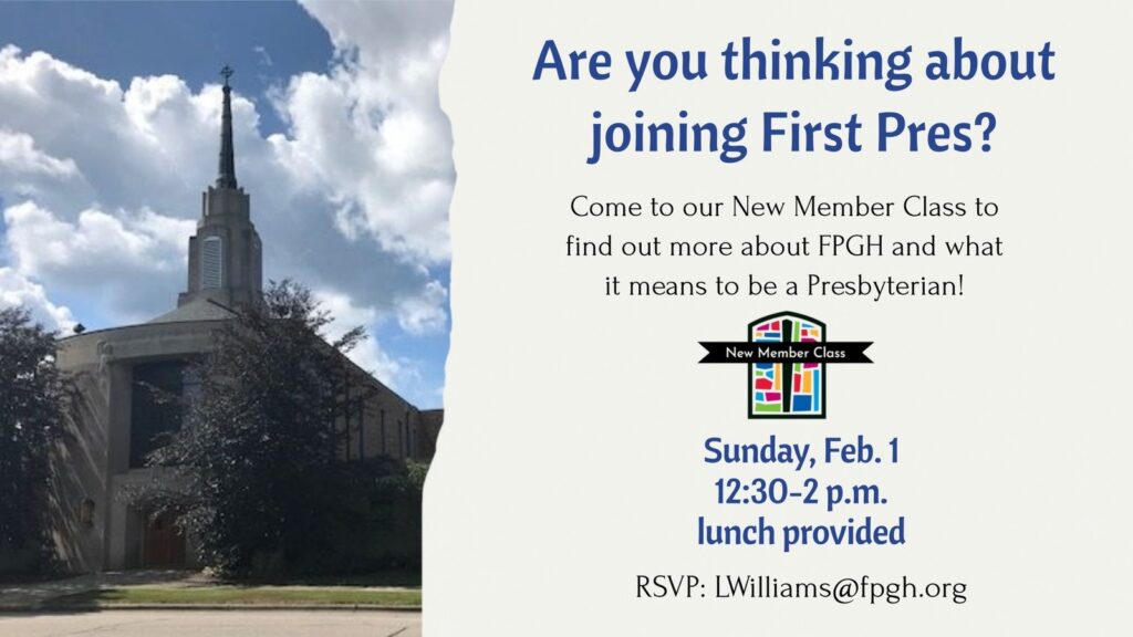Are you thinking about joining First Presbyterian Church or are you just curious about what it means to be Presbyterian? You are warmly invited to attend a new member class on Sunday, Feb. 1, from 12:30-2 p.m. A light lunch will be provided.