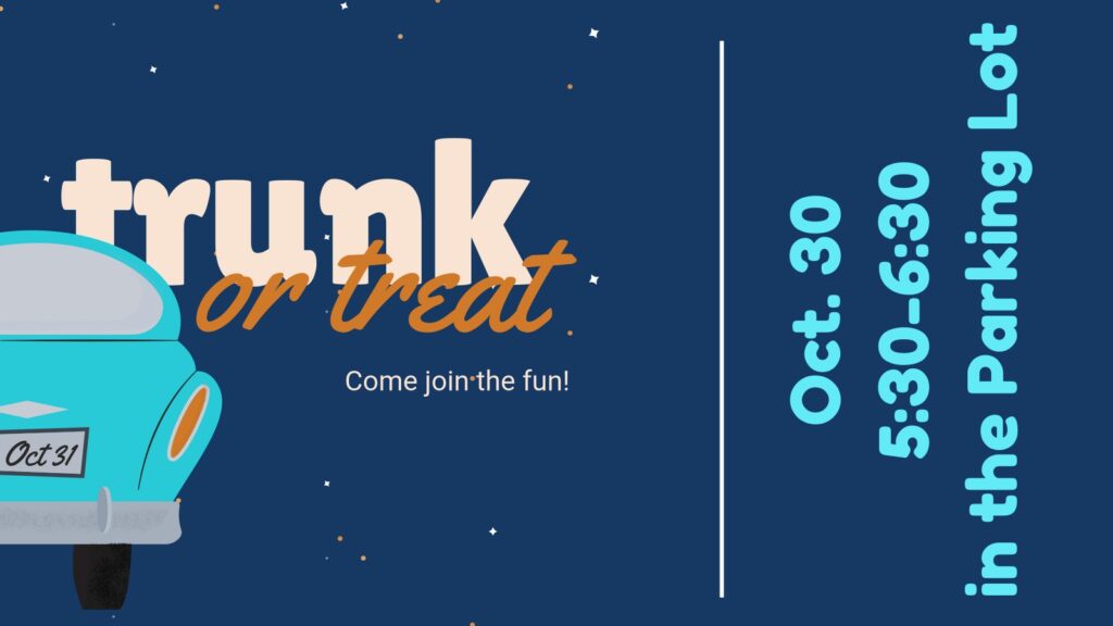Whether you want to decorate the trunk of your vehicle and pass out candy, or have kids who want to trick or treat, this fun event is for you, and all are welcome. Please keep in mind that because many small children will be attending, we ask you to stay away from scary decorations.