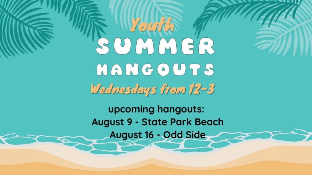 All youth in grades 5-12 are invited to come and hang out together with Hannah! On Wednesday, August 9, we’ll be at the state park beach, and on August 16, we’ll be hanging out together at Odd Side. Bring a friend and join us for some fun!